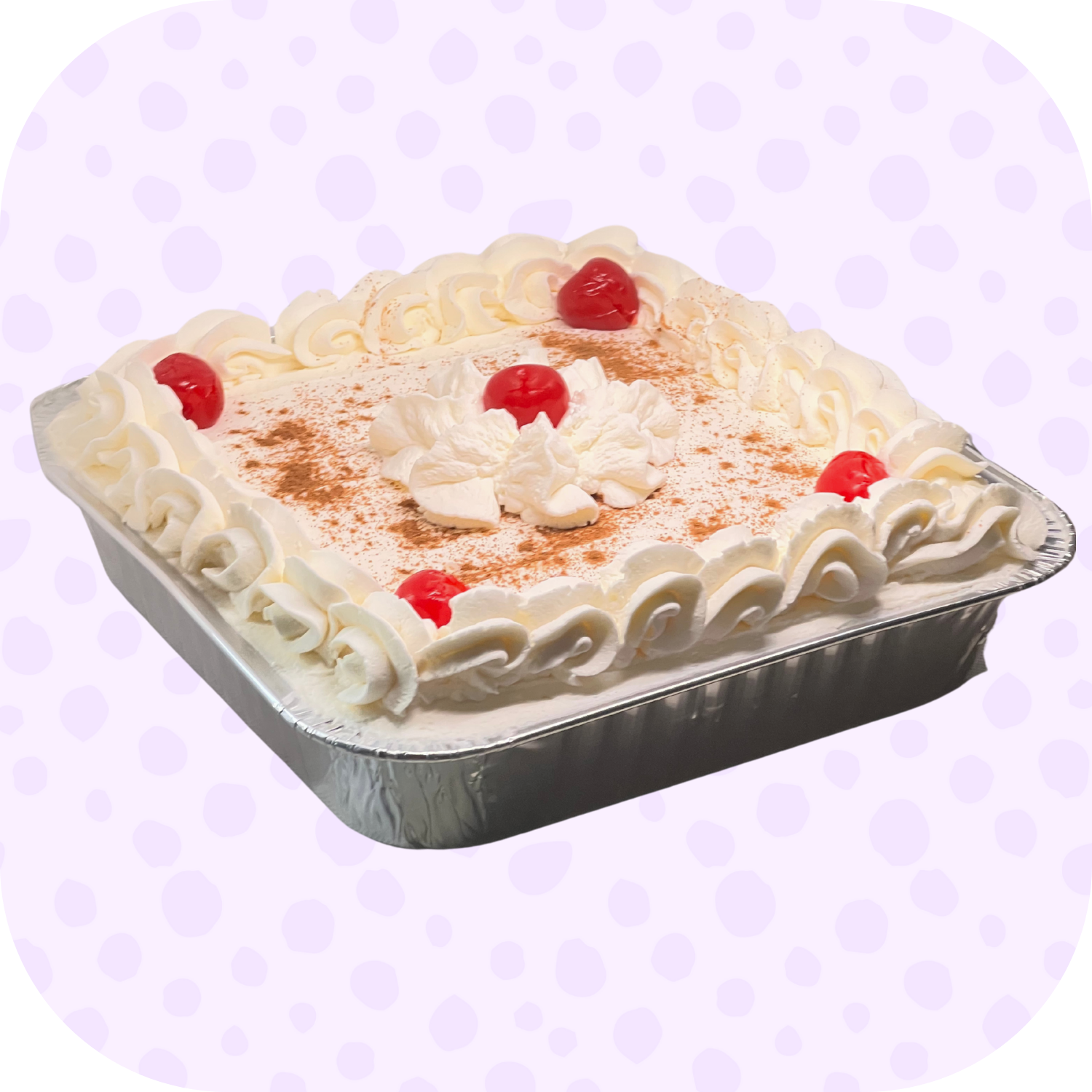 A: We offer a rotating menu of Tres Leches flavors in our large (13x9) and medium (8x8) , and Mini (6.5oz) trays!